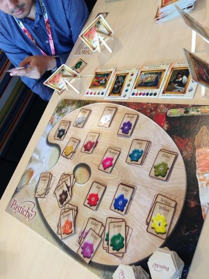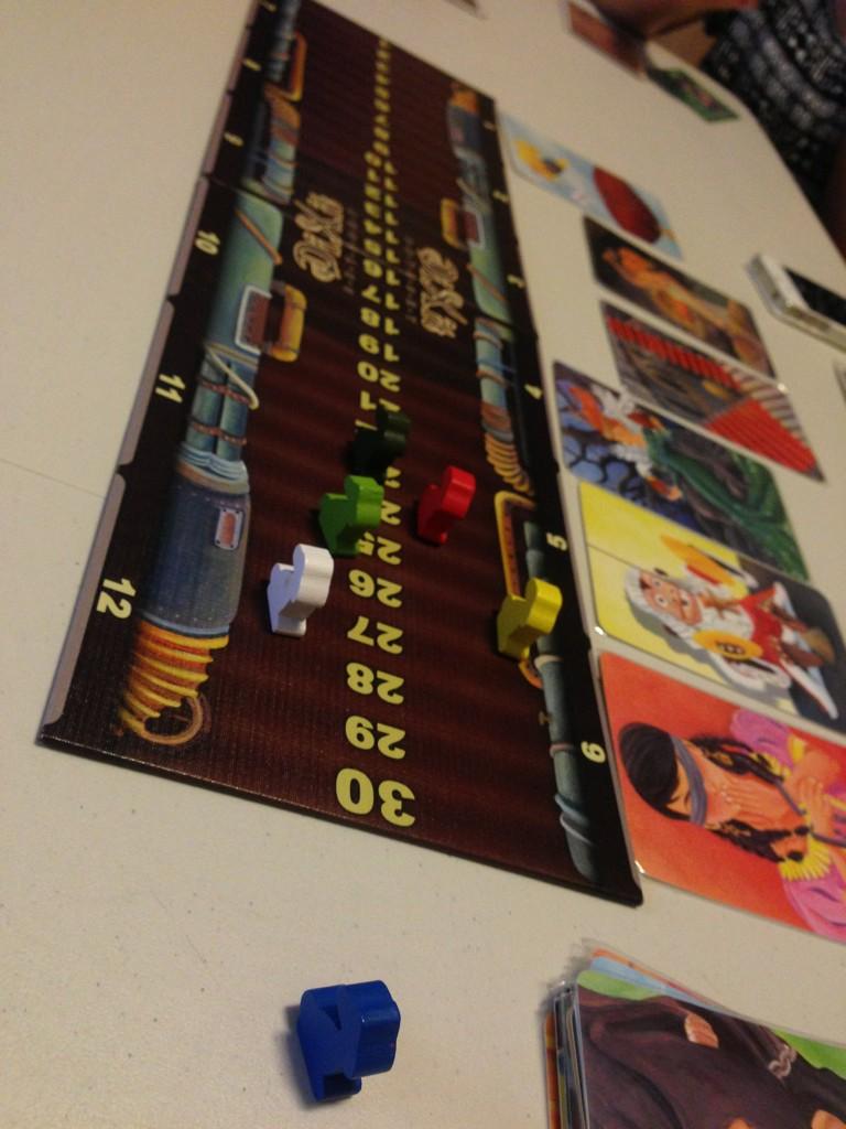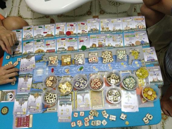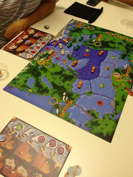 Next game we played was Mare Balticum which is essentially a fish game with a unique movement mechanism. Each player has 3 actions per turn which you can either move a ship token (all ships must still be linked), fish (pick up a fish token where you have a ship on) and sell fish (at a port where your ship is there). Easy to teach and play and there is a bit of strategic depth to the game which is surprising given how light the game seems to be. The artwork is gorgeous and it was made known to me that they made the boards in clay and took a picture and printed the pictures out. That to me is awesome though they could probably sell the clay version as a deluxe version of the game. Good game, good game.