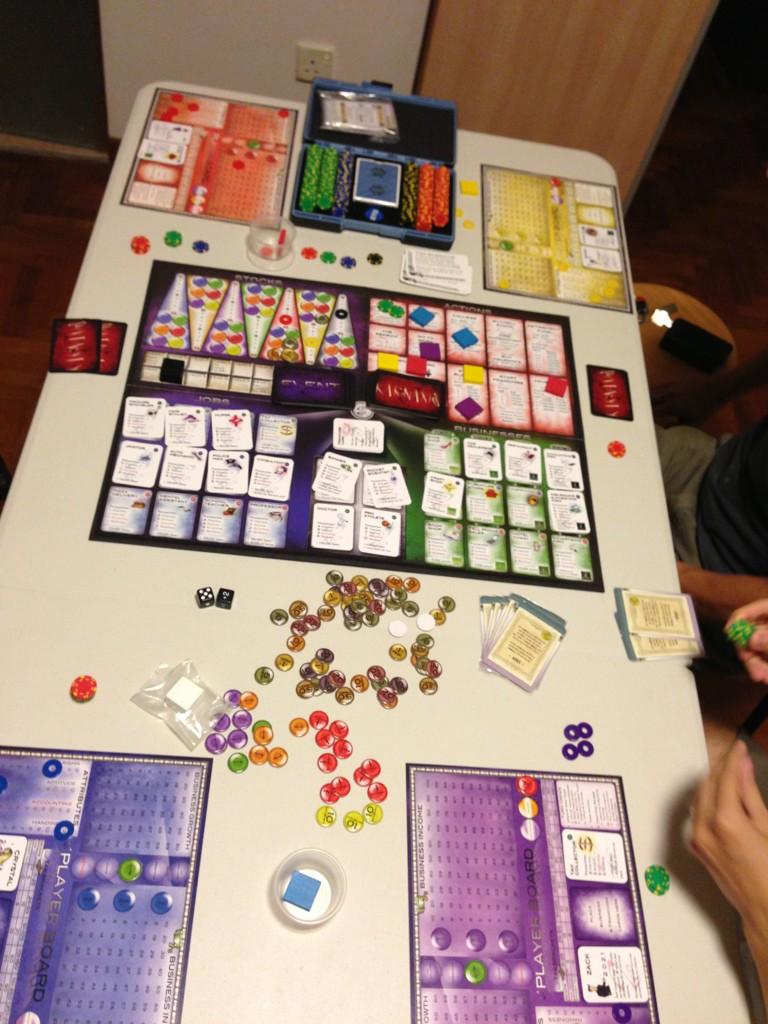 So one from my usual gaming group bought this and brought it for us to try out. Its a game that reminds me of game of life or even Ratrace (from donkey years ago). Basically you have a character and some stats to start off with and throughout the years, try to earn as much money as you can. You can do so from a variety of ways which is working hard, achieving your Karnaxis (or goal in life), planning for retirement, stocks as well as setting up companies. Even though the theme is overused and not uncommon, I did not feel the game was very bad or boring. Granted there is now errata and new version of the rules to counter some of the complaints and lack of proper play testing, we still had quite a bit of fun. Oh and the art is horrible. It could have been done way better and may have brought up the level of enjoyment up quite a few notches. But nevertheless, it is pretty fun. You can play this solo as well. Not exactly a modern boardgame but still quite playable.