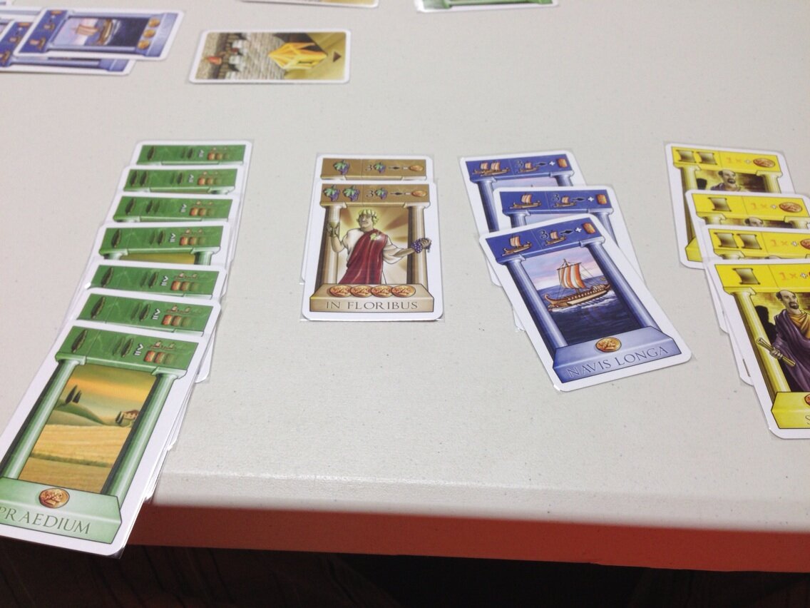 Interesting set collecting game where you are fighting against Rome unless you are the secret spy which means if Rome wins, you win. During your turn, you will take 3 cards, one at a time and decide where the cards go. This portion is similar to Biblios as you need to decide one at a time where to place them. Then you get to buy cards and play cards from your hand. You will then get income and your turn ends. Now the interesting part of the game is that to win, you will need to have at least 4 of the sets in front of you that have more cards than those that Rome has. Another way to win is if Rome wins and you have the secret spy card. Its not a bad card game but for my first game at least, kinda hard to beat Rome. Its possible that its my first game and I still haven't figured out some of the tactics yet but I can see how this will be fun. Not sure how well it will do with more players though because with 2 its already quite hard to beat rome. Will like to give it a try again to see how it works with more players.
