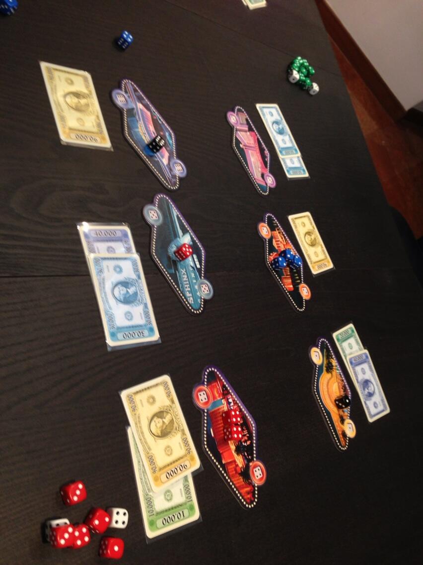 Players then look at each casino and count the number of dice they have there. If your number matches any other players or the white dice, then you are out. The first non-matching majority player will take the highest value money card. Then the 2nd non-matching majority will take the next card (if any) and so on and so forth. In this way, each casino will be resolved and money collected. Players play a few rounds and then whichever player that has collected the most $ will be the winner.