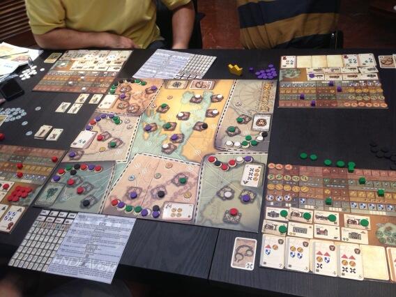 The artwork is not bad and functional. Theme wise though there really isn't a lot of theme and this is a typical euro game. It is also an area control game as well because the number of your tokens in a particular area often denotes which level cards you can obtain and the higher the level, the better rewards you will get. This is my first time playing and I was planning to go an alternative path from what the rest are doing however our paths soon cross as they started to dabble into the exploration paths I was on. The buildings that are available for building are crucial as they often provide you with 2 actions which is quite powerful in the later game when snatching the governor cards or other cards from each other.
