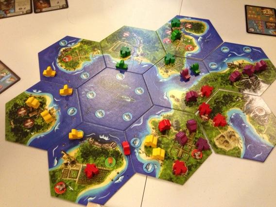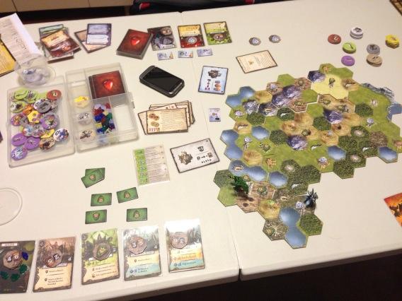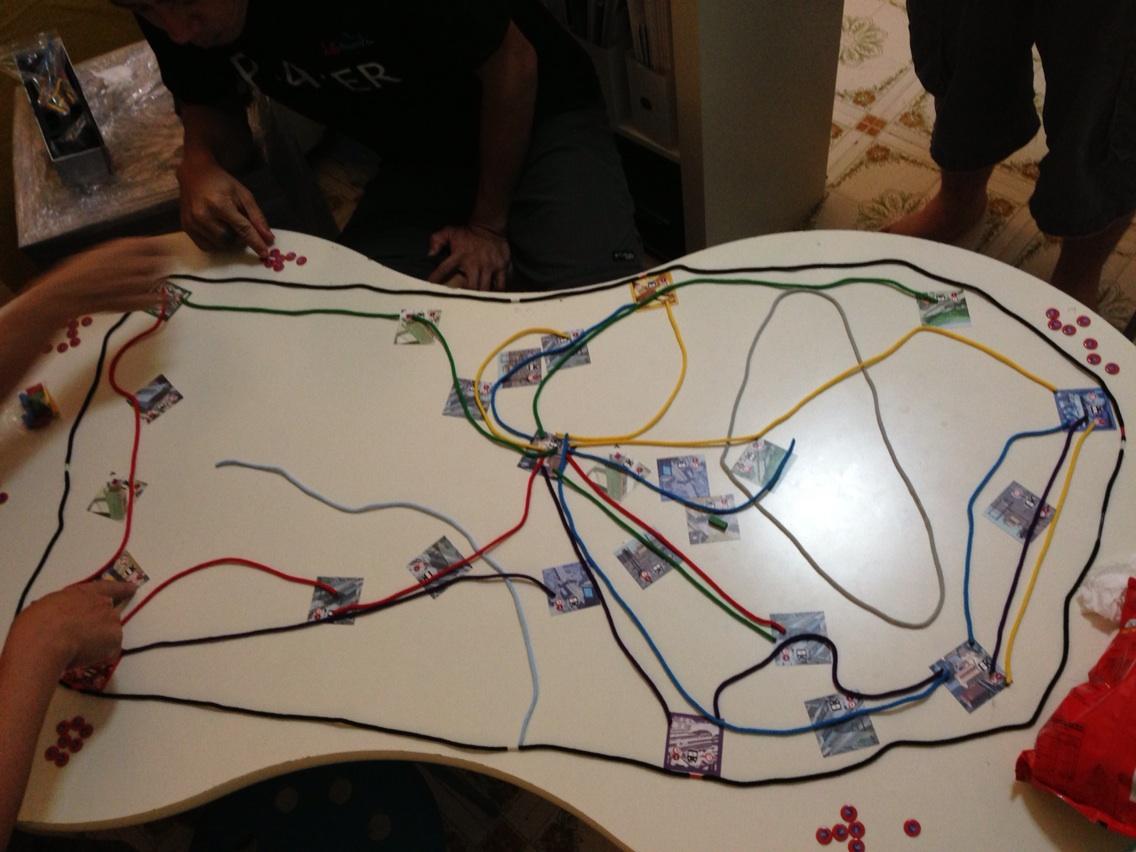 We also played the new version of String Railways. I have played this game (in its original format) once maybe 2 or 3 years ago and it is a simple light game with an innovative method of laying tracks by means of strings of your own color. The new art I did not like as I preferred the previous one, with its anime like characteristic. That being said, the group that I was playing to managed to make this game a rather cut throat game as we try to screw each other up by always attempting to reach their starting station or lay tracks to make it difficult for them as well. Light game and you should try it at least once.