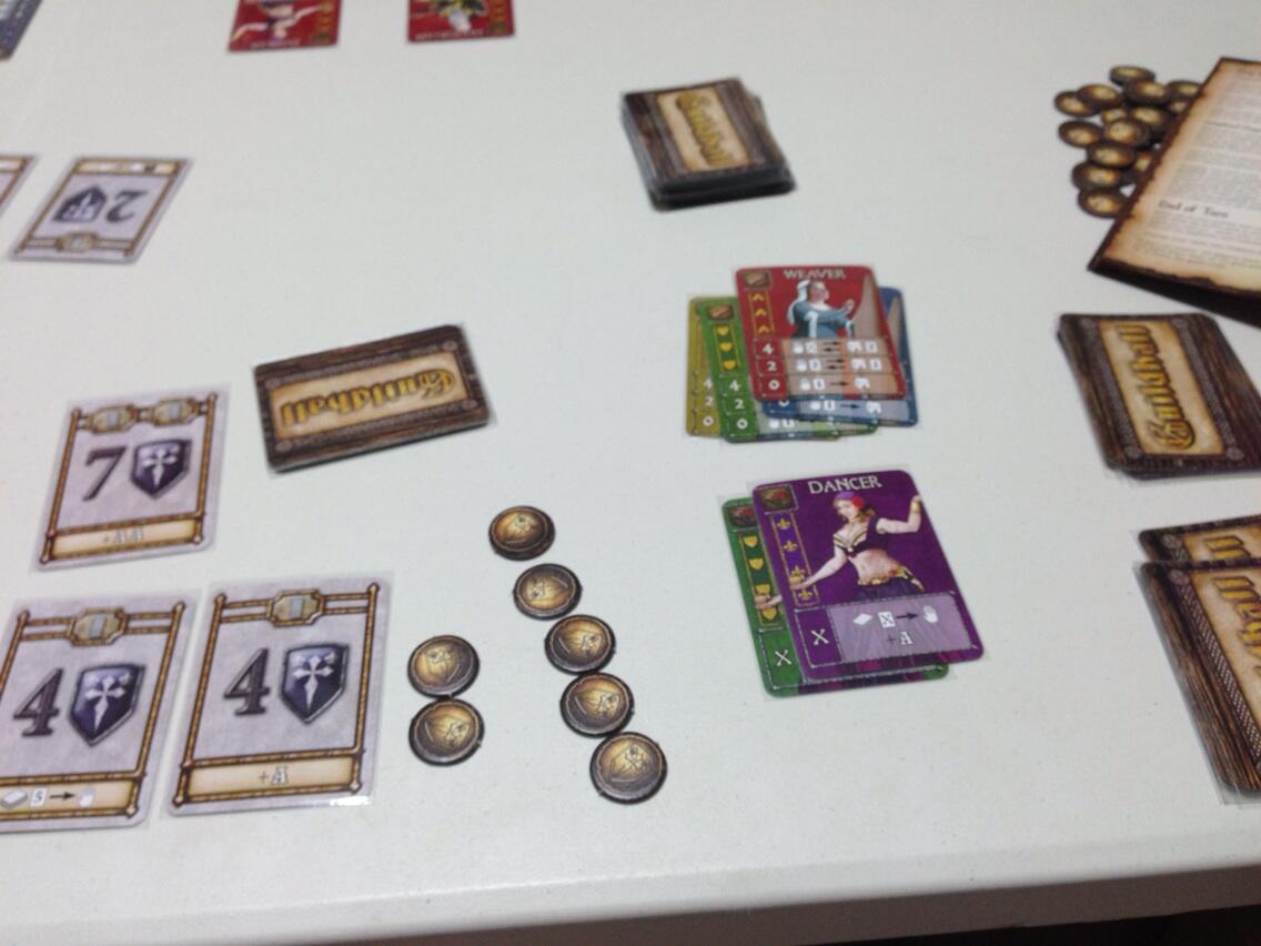 Tournay! Not really a successor of the popular Troyes but based on the same art and theme. I have been wanting to try this since it is similar to Troyes which I liked and quite highly rated. It is essentially a card game with a bit of "city" building aspect. There is a set of cards in the "market" where you can purchase from and also events (similar to Troyes) which will impact everyone. In addition, some of the cards in the Market are Prestige buildings which will provide scoring to everyone (similar to characters in troyes) if they are built. At the beginning of your turn, you can build a card into your district. Take note that your district can only accept 9 cards and is laid out in a 3x3 format. You can build over existing cards. During your turn there are 6 pple (these are similar to the dice in Troyes) where you can activate to either draw cards or use a building in your district or resolve an event card. Whenever a Town Crier card appears, all the events will trigger. The game ends when the number of town crier cards that have been revealed exceeds the number of players by 1 and at least 1 player has completed his 3x3 grid and has at least 2 prestige buildings. This does mean that the game can get a little bit too long but I will need to play again to be sure.