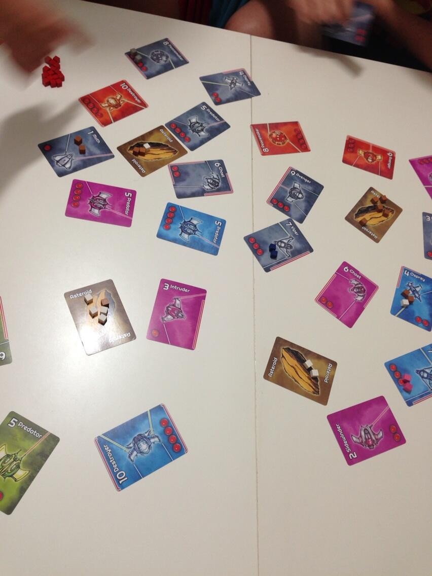 A light filler this one and self printed from Artcow. In the game, players will simultaneously try to place their set of plane cards (1 card at a time drawn from their deck) onto the board which was initially seeded with asteroids. Players do this, taking into account the ship number (as it will determine the sequence of firing from in ascending order) as well as the placement of the ship card (because ships have shields and different angles of firing). Players also have to take note not to place cards onto other cards as these are disqualified. Once a single player has finished playing ALL his/her cards, he declares done and the placement round has ended. Now all players look at their ships in ascending order and determine whom they may have shot at and place their markers on the ships. If it exceeds the number of red buttons on that ships (indicating health points), then that ship is destroyed and the player with the most damage markers on that ship will claim that ship as points (the red buttons indicate points this time). If an asteroid was hit, then that ship actually harvested minerals and claims cubes from that asteroid (as long there are any cubes left on that asteriod). After resolving the level 10 ships, players see how many points they have gathered and the one with the most points is the winner.